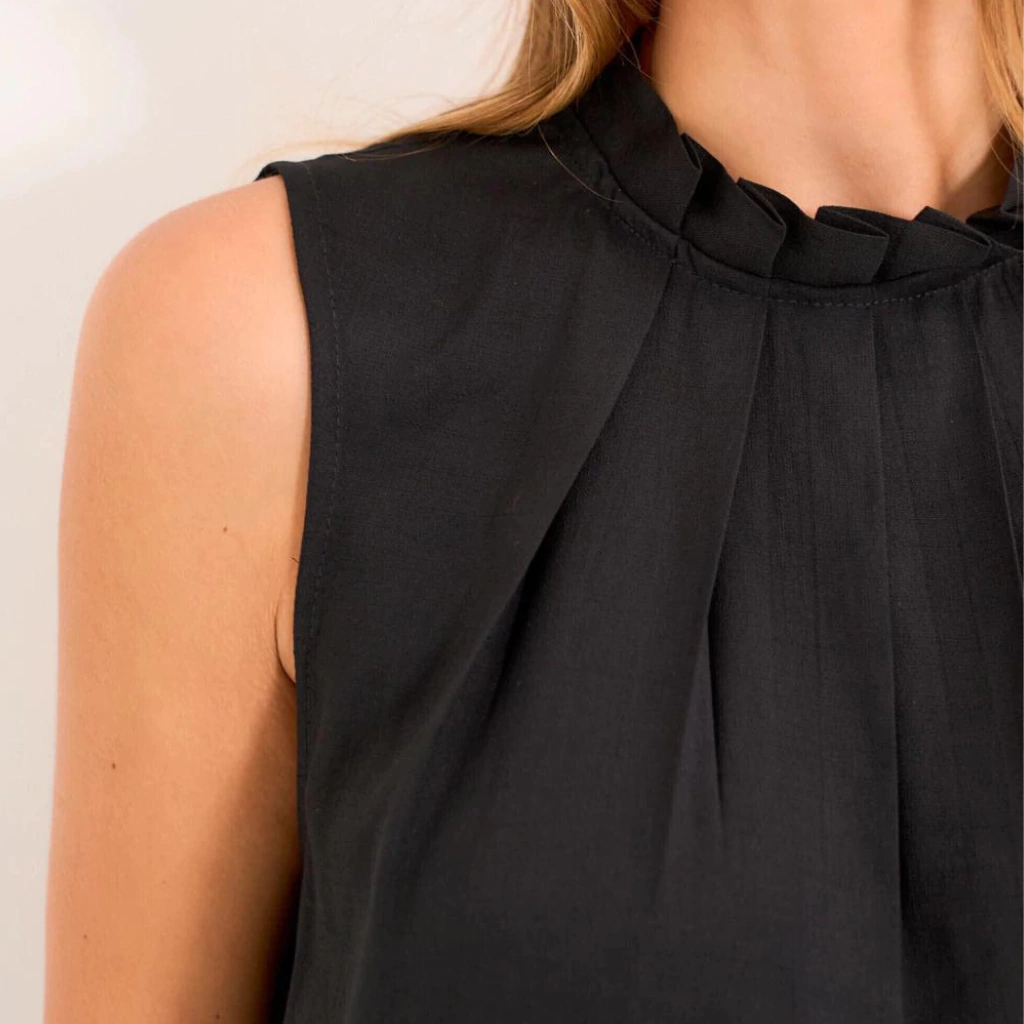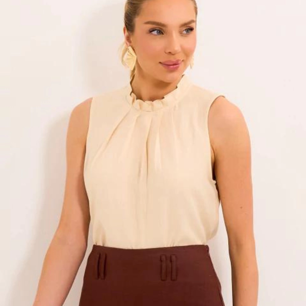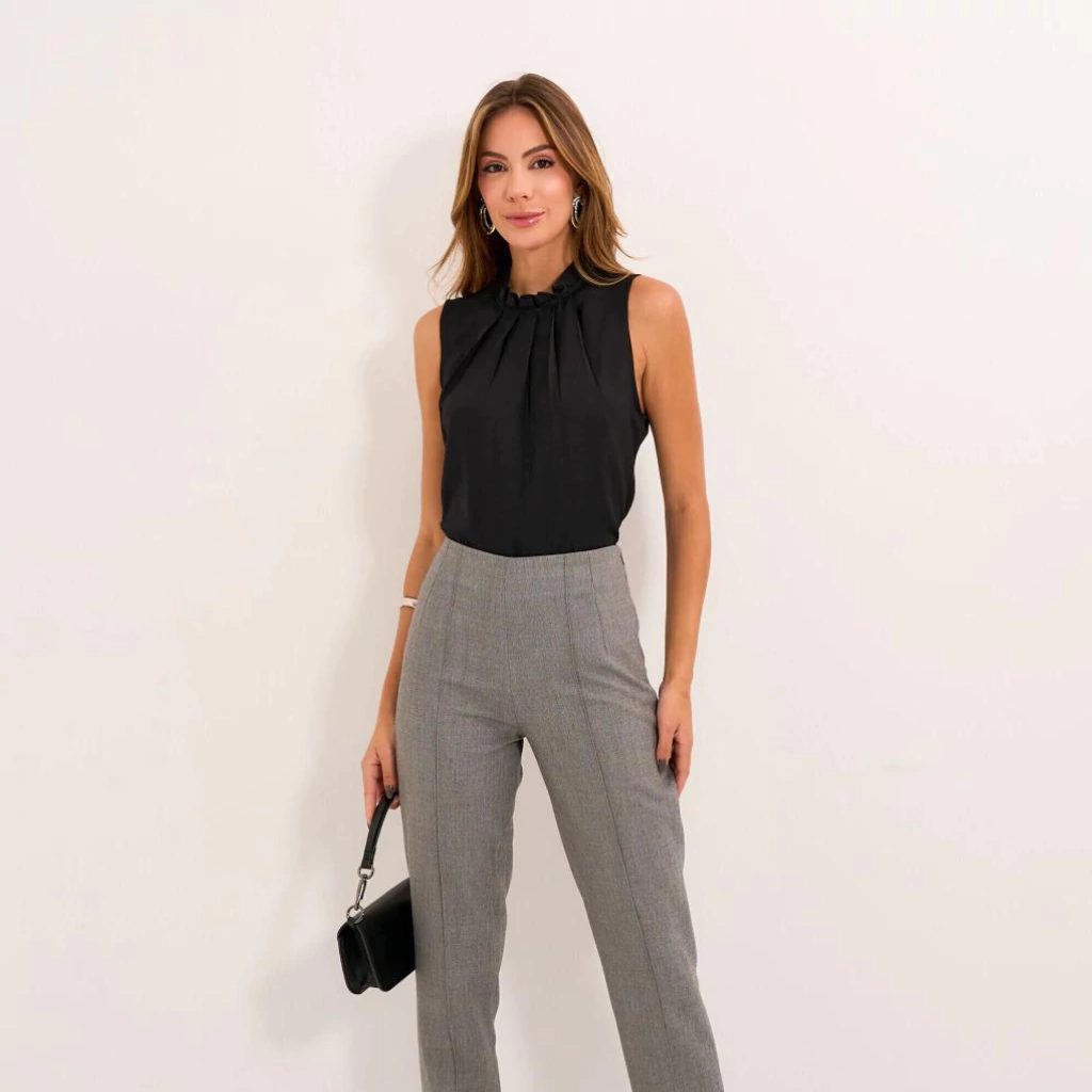 Blusa confeccionada em crepe com caimento fluido. Possui modelagem de regata, gola alta com detalhe de pregas, que proporciona mais elegância. As pregas se prolongam no busto, valorizando o colo da mulher. Fechamento nas costas com decote gota e botão interno básico.